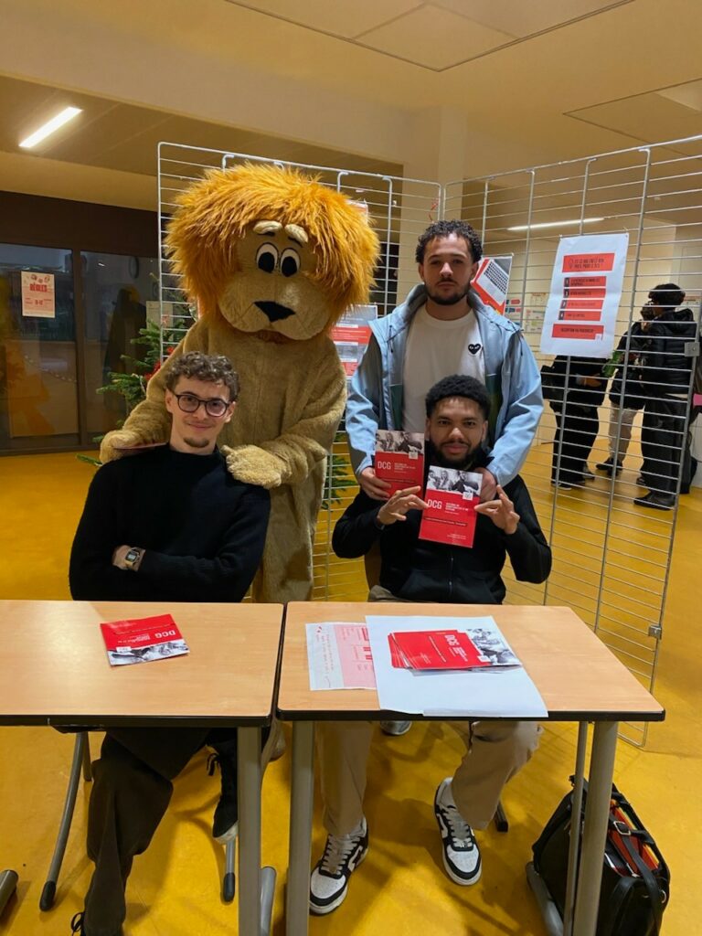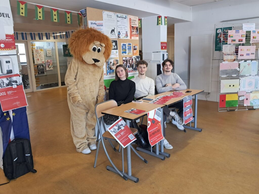 Afin d’attirer l’attention des lycéens, l’un des étudiants a enfilé la mascotte de la section (un sympathique lion !), créant une ambiance conviviale et ludique.